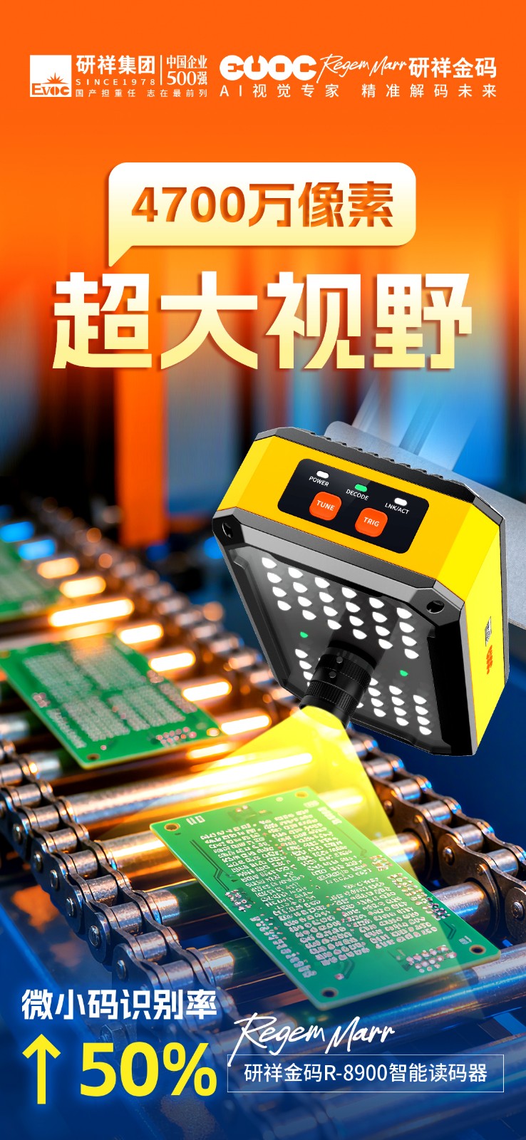 作为行业首款4700万像素的智能读码器,z6com·尊龙(中国)时凯集团R-8900单次识读即可覆盖500+条码,视野范围高达常规读码器的25倍。